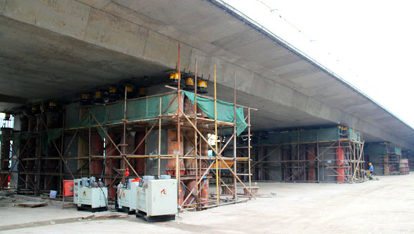 上海楓涇立交D2匝道橋梁整體抬升糾偏工程 我公司提供整套PLC多點同步頂升設備和現(xiàn)