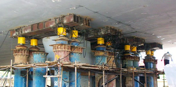 大體量曲線梁頂升---廈門連岳路立交整體同步比例調坡頂升7.5米;提供全套頂升、液動支撐跟隨及控制系統(tǒng)和現場頂升服務。