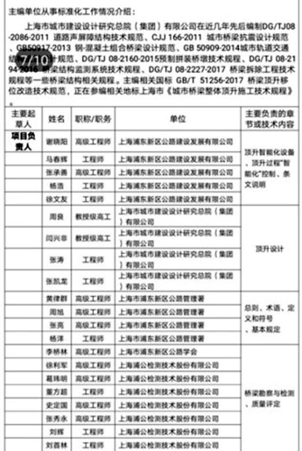 上海市《城市橋梁整體頂升施工技術(shù)規(guī)程》編委成員