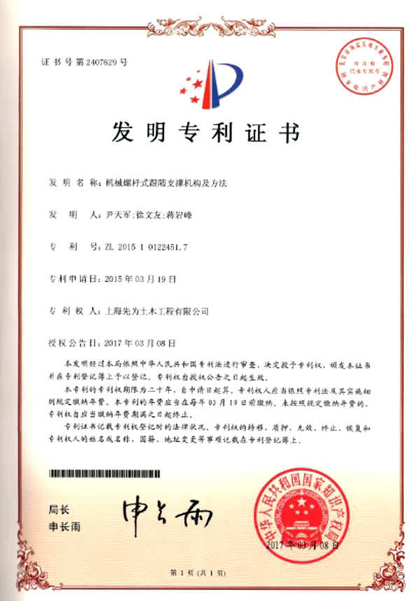 并聯(lián)合施工單位開發(fā)申請了“機(jī)械螺桿式跟隨支撐機(jī)構(gòu)及方法”發(fā)明專利。